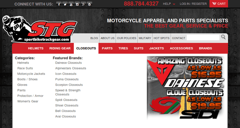 Sportbike Track Gear (STG) is an online platform specializing in motorcycle gear, parts, and accessories. The website provides a wide selection of products including helmets, jackets, tires, riding suits, and other motorcycle equipment from well-known brands. The platform focuses on offering quality gear, competitive pricing, and reliable customer service for motorcycle enthusiasts and professional riders.